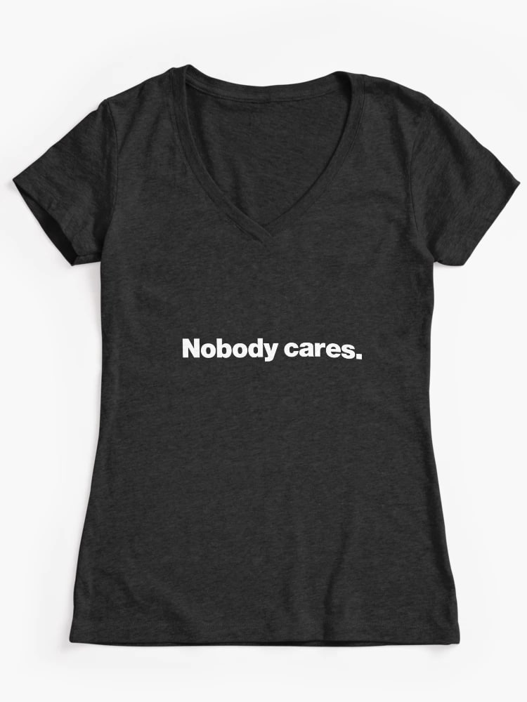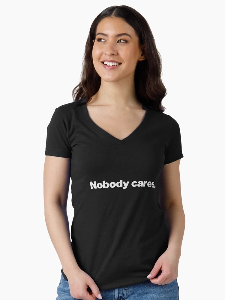 Nobody cares. Fitted V-Neck T-Shirt is a premium apparel piece from Gsa-group-papp Store is owned and operated by Shasta Medical Partners, LLC designed for daily wear.